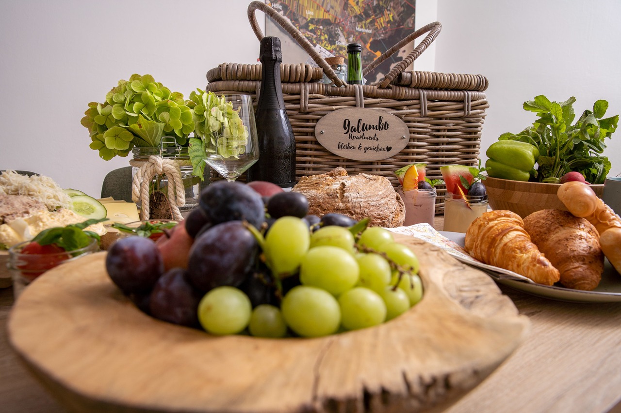 Unser GALUMBO Frühstückskorb ist gefüllt mit allerlei regionalen Köstlichkeiten und wird morgens zum gewünschten Zeitpunkt direkt vor ihr Apartment gestellt. Gerne auch vegetarisch zubereitet!